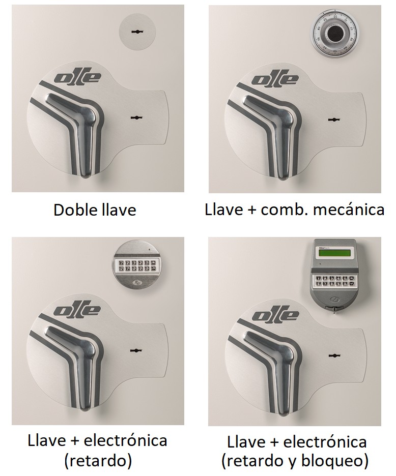 | Cerradura | Cerradura de llave, Llave y combinación mecánica, Llave y electrónica, Llave y electronica retardo con bloqueo |