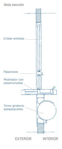 Ventanilla dispensadora de productos Nº 42. Mostrador con cristal, pasavoces de chapa perforada, tapaviento, pasamonedas deslizante con cierre y esclusa de torno giratorio pasapaquetes.